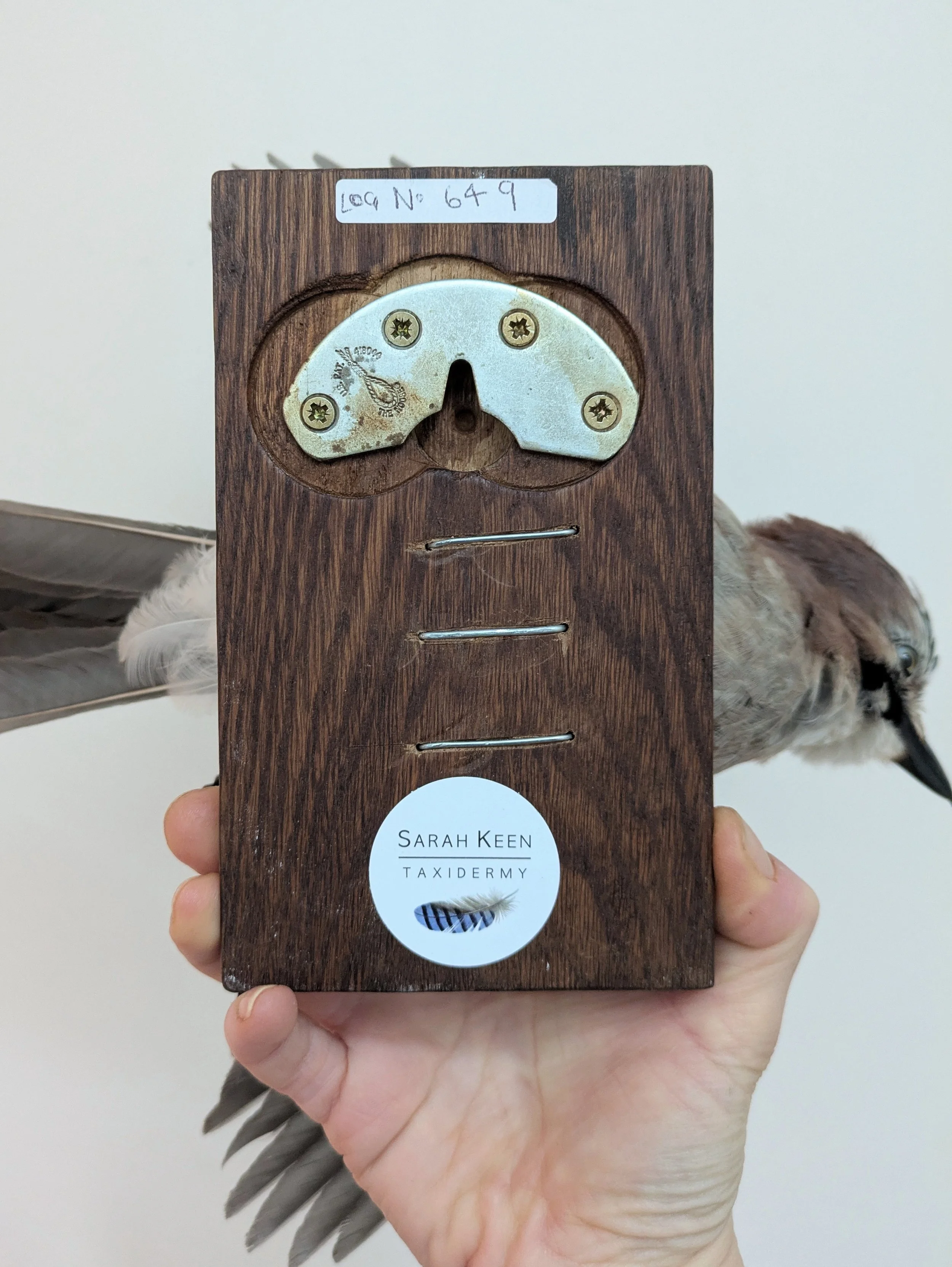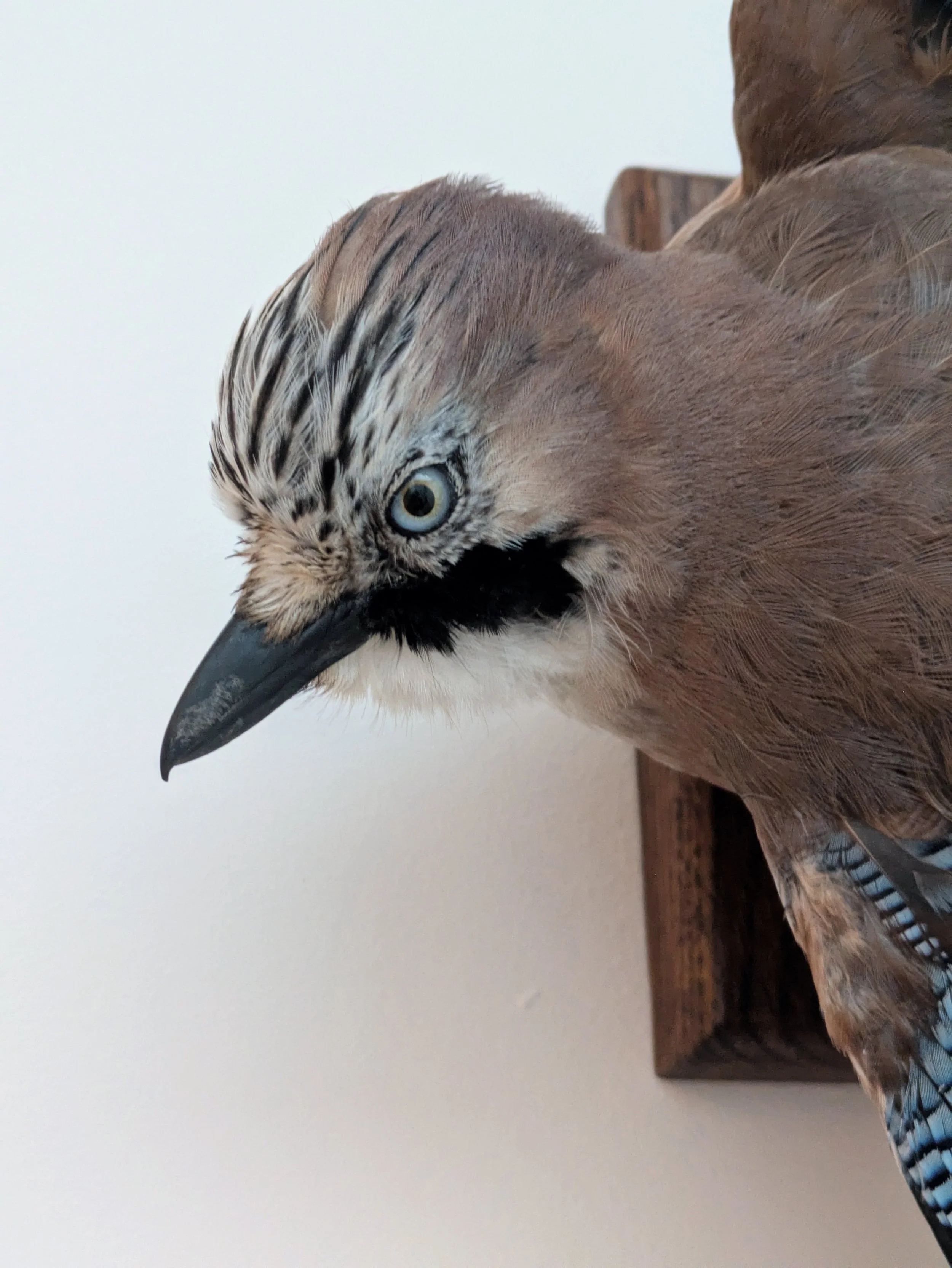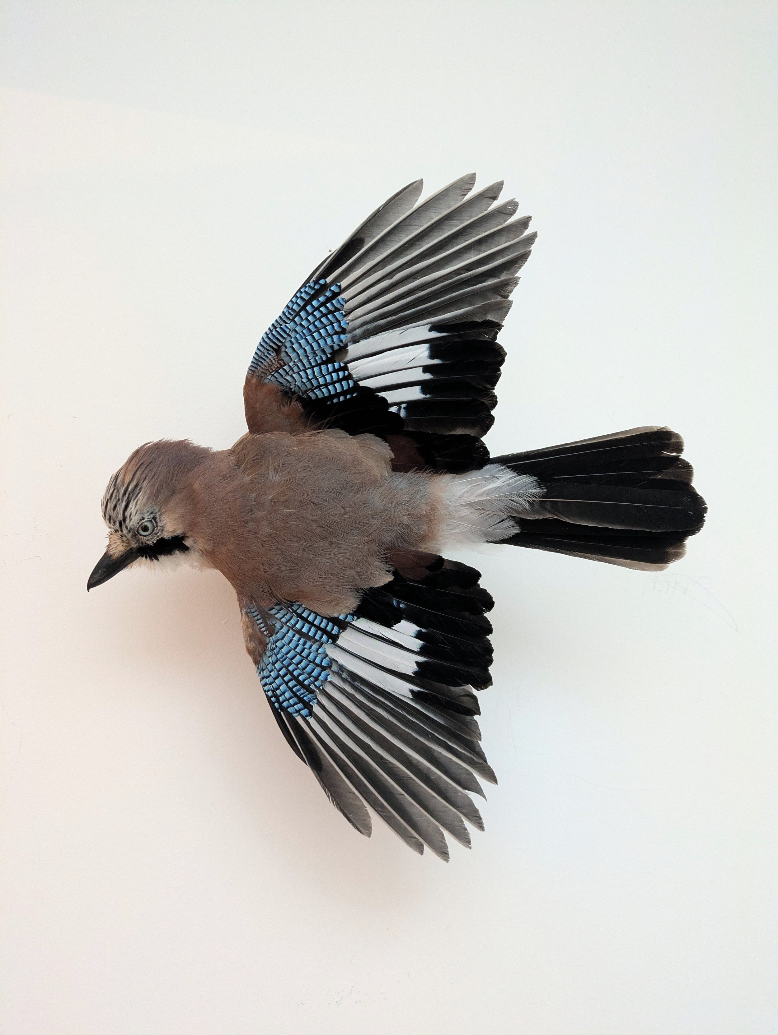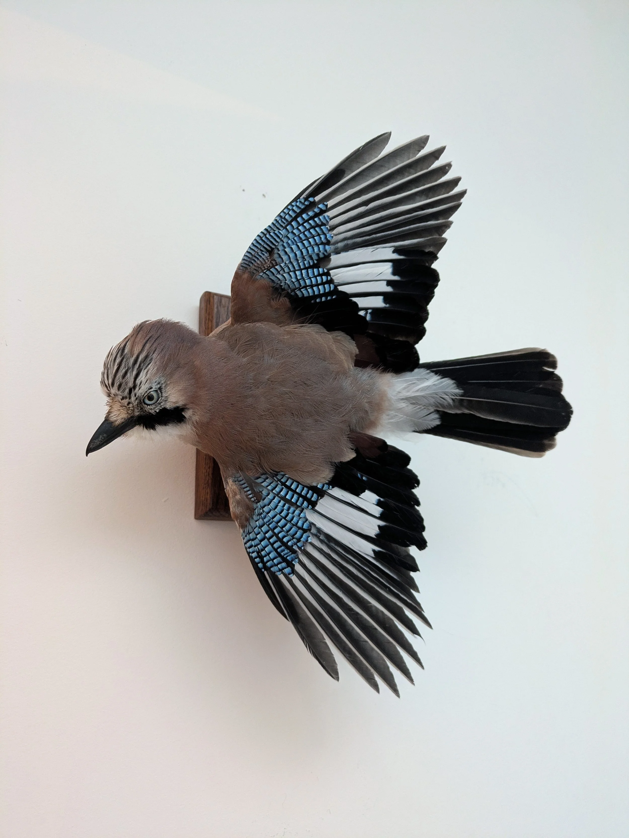 Taxidermy jay, wings outstretched in a natural flight pose. A sturdy noose hanger has been added to the back plate, so it’s easy to hang securely flush to the wall.